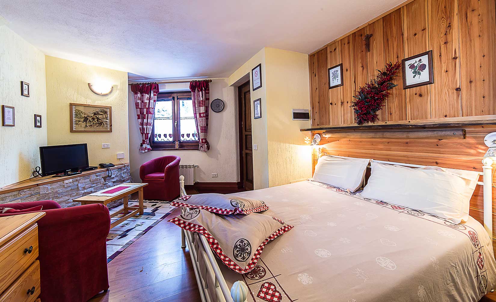 Camera matrimoniale spaziosa e luminosa, arredata in tipico stile alpino con pareti in legno e dettagli caldi che richiamano la tradizione di montagna. L’angolo relax con poltrone e la cura degli arredi creano un ambiente accogliente e confortevole, ideale per una coppia in soggiorno a La Thuile.