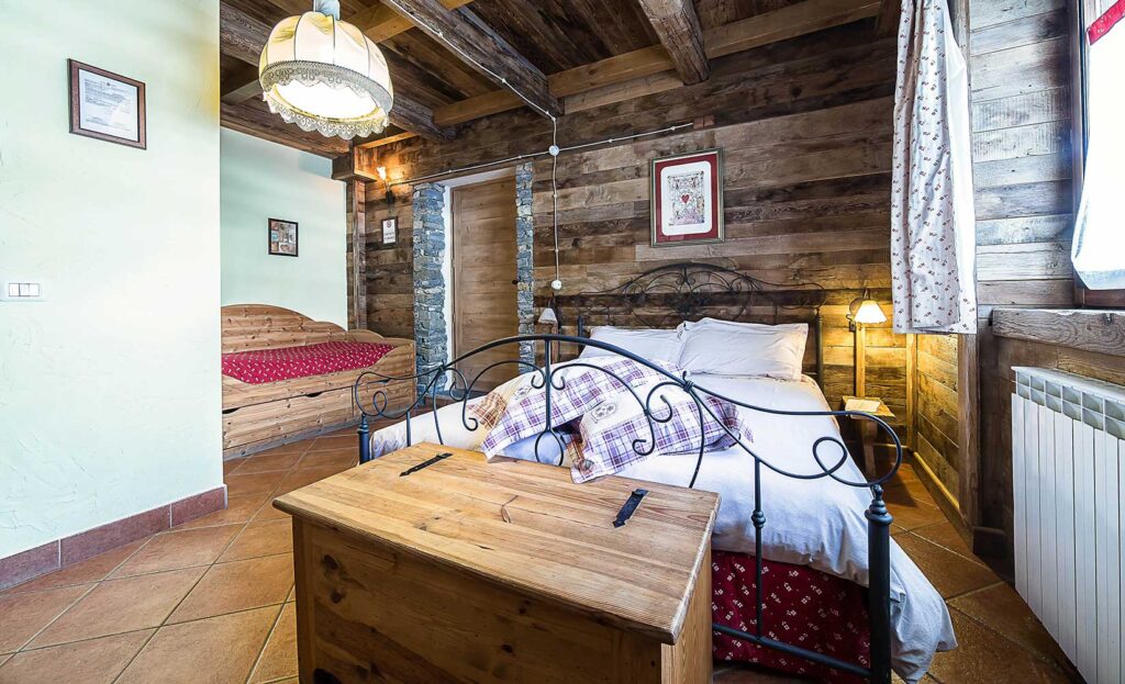 Camera matrimoniale dal carattere autentico, con pareti in legno, pietra a vista e soffitti con travi che richiamano la tradizione alpina di La Thuile. L’ampiezza degli spazi e il letto aggiuntivo la rendono ideale anche per piccole famiglie che cercano comfort e atmosfera di montagna.